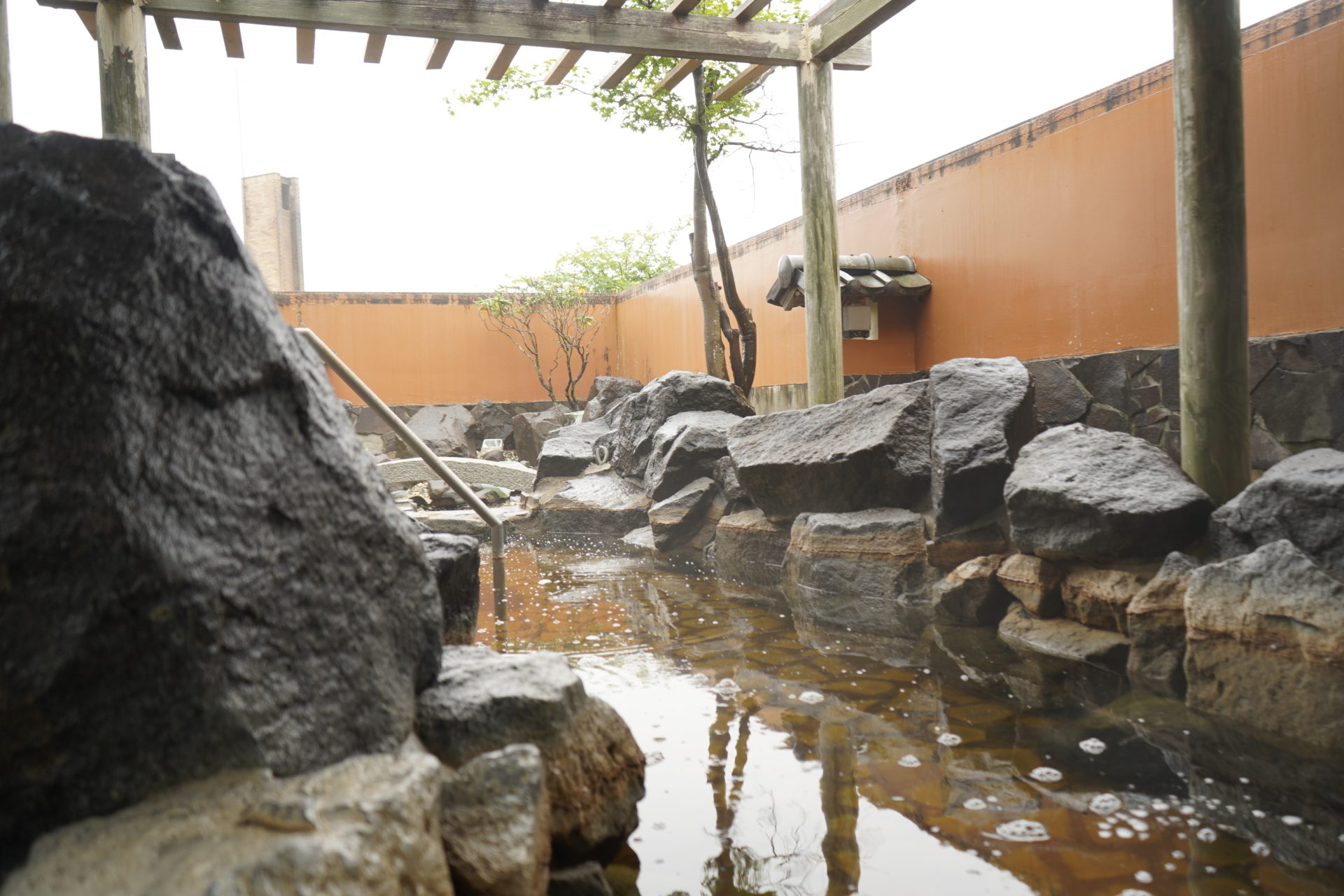 雰囲気抜群の露天風呂を完備した広い浴場。加温、加水、循環なしの、かけ流し。肌がツルツルになるアルカリ性の湯がたっぷりと湧き出ています。