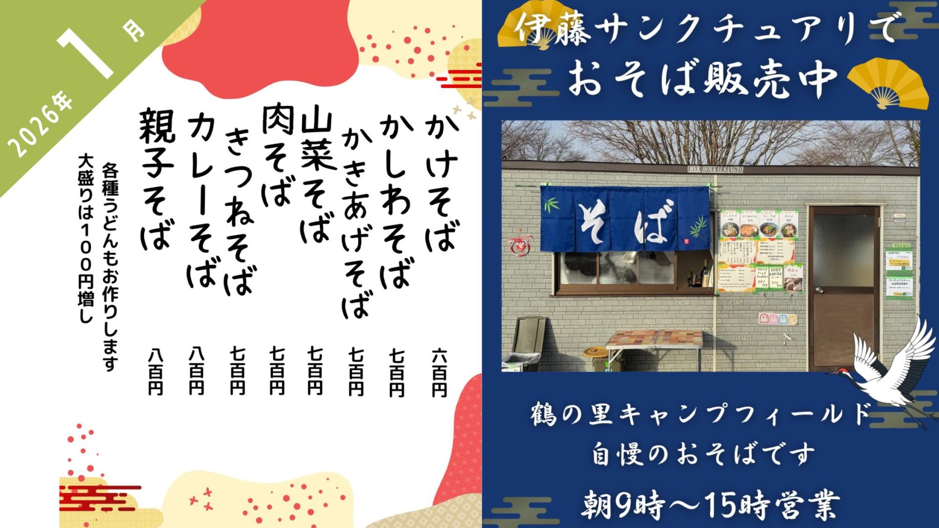 今年も、タンチョウ観察の名所「伊藤サンクチュアリ」にて、鶴の里キャンプフィールド自慢のおそばを販売開始しました!