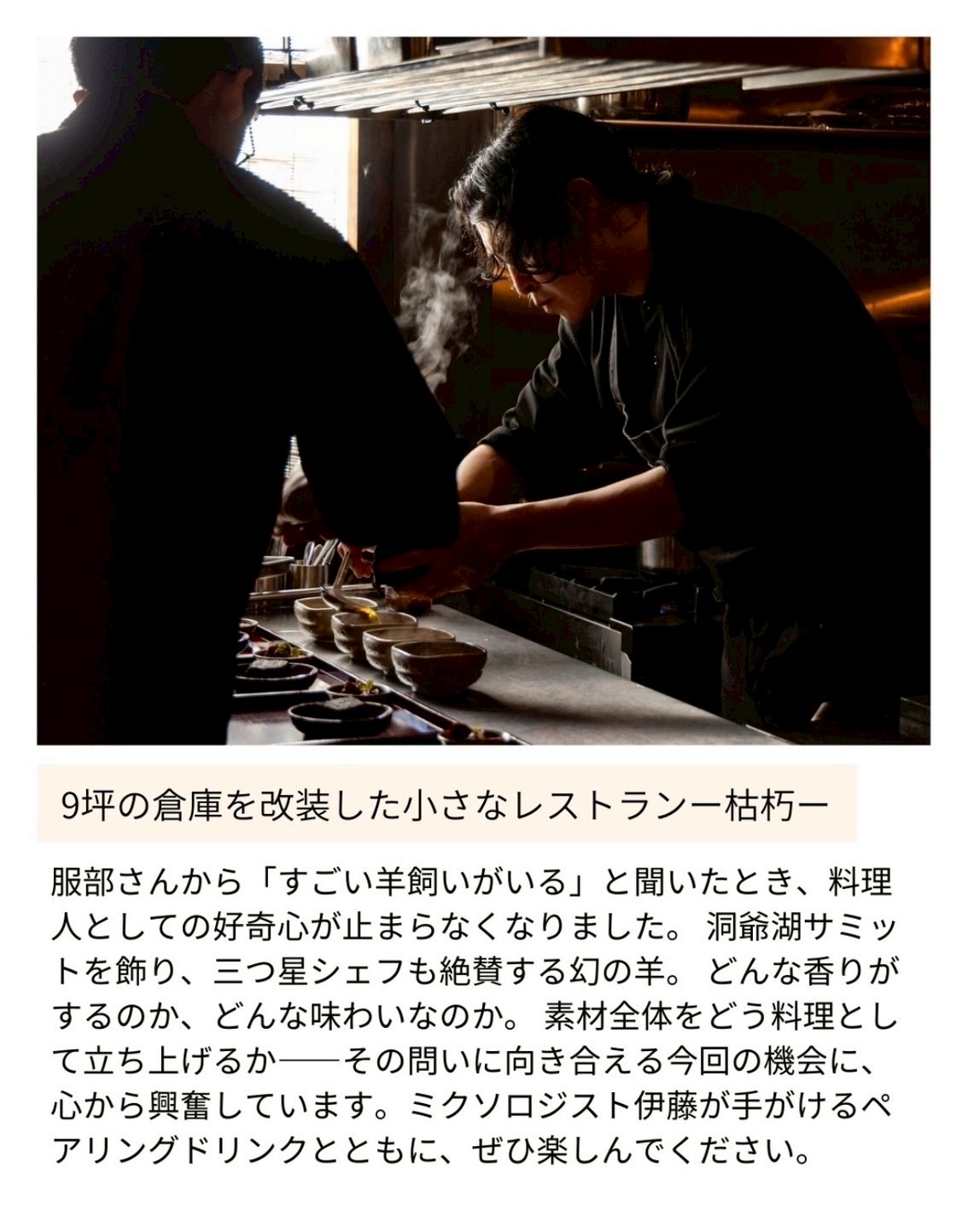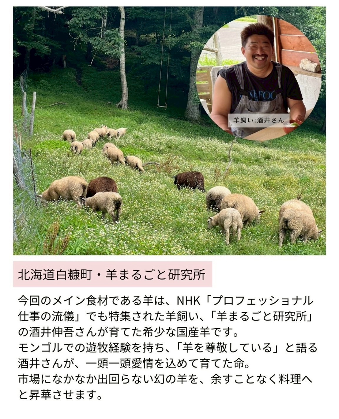 羊飼い・料理人・この土地が出会い、羊を余すことなく味わう食体験が生まれます。主役は、国内流通わずか0.6%の国産羊。